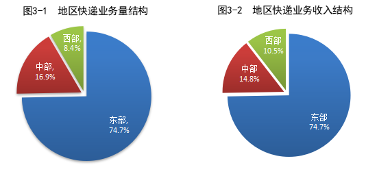 1月份,東、中、西部地區(qū)快遞業(yè)務(wù)量比重分別為74.7%、16.9%和8.4%,業(yè)務(wù)收入比重分別為74.7%、14.8%和10.5%。與去年同期相比,東部地區(qū)快遞業(yè)務(wù)量比重下降2.5個百分點,快遞業(yè)務(wù)收入比重下降1.9個百分點;中部地區(qū)快遞業(yè)務(wù)量比重上升1.4個百分點,快遞業(yè)務(wù)收入比重上升0.8個百分點;西部地區(qū)快遞業(yè)務(wù)量比重和快遞業(yè)務(wù)收入比重均上升1.1個百分點。