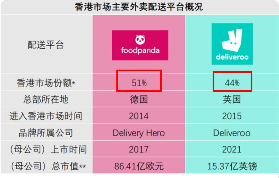 目前香港外賣市場中的平臺主要有二,Deliveroo和Foodpanda,他們占據(jù)市場份額的90%。此前海外巨頭Uber Eats曾嘗試進入香港市場,但經(jīng)過幾年的努力之后,市場份額始終無法突破5%的天花板,于是在2021年Uber Eats選擇退出香港外賣市場。
