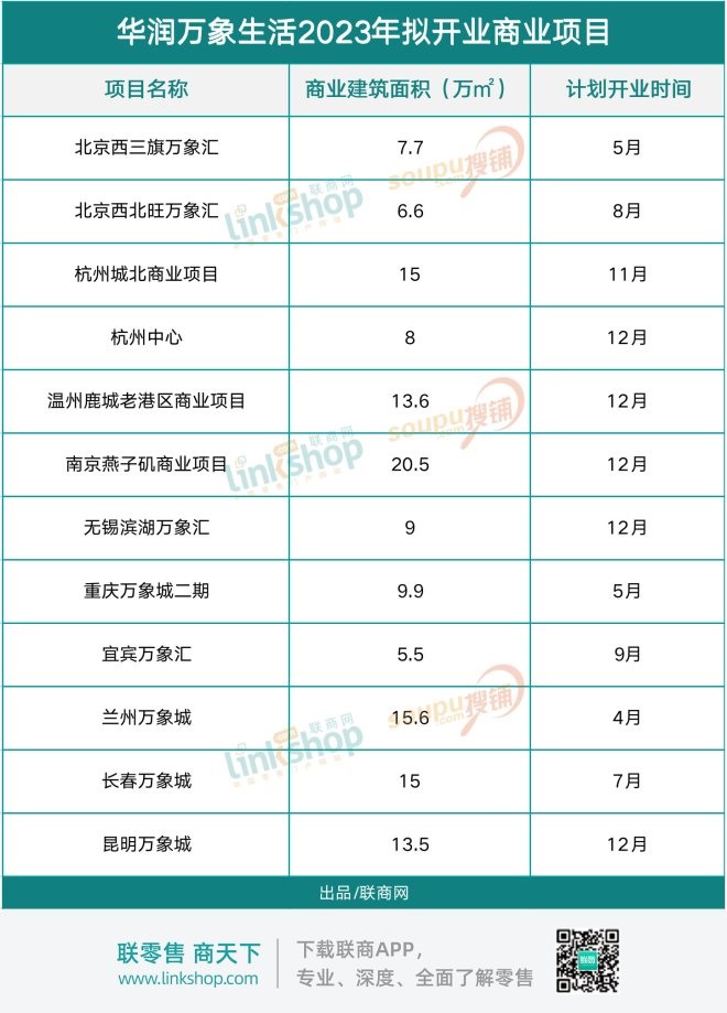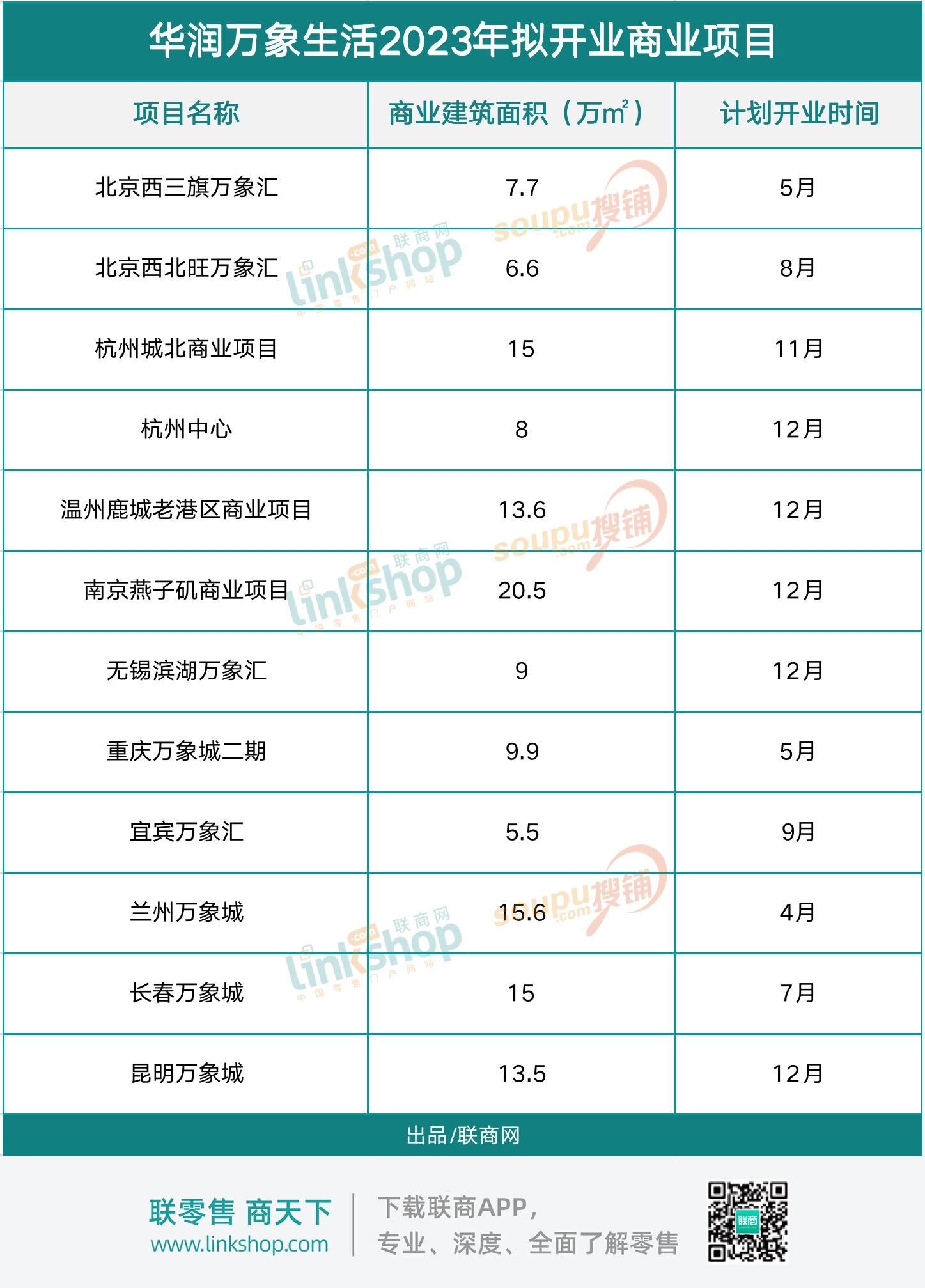 2023年的供應(yīng)情況上,華潤萬象生活將投運(yùn)12個商業(yè)項(xiàng)目,包括了蘭州萬象城、北京西三旗萬象匯、重慶萬象城二期、長春萬象城、北京西北旺萬象匯、宜賓萬象匯、杭州城北商業(yè)項(xiàng)目、杭州中心、溫州鹿城老港區(qū)商業(yè)項(xiàng)目、南京燕子磯商業(yè)項(xiàng)目、昆明萬象城、無錫濱湖萬象匯。