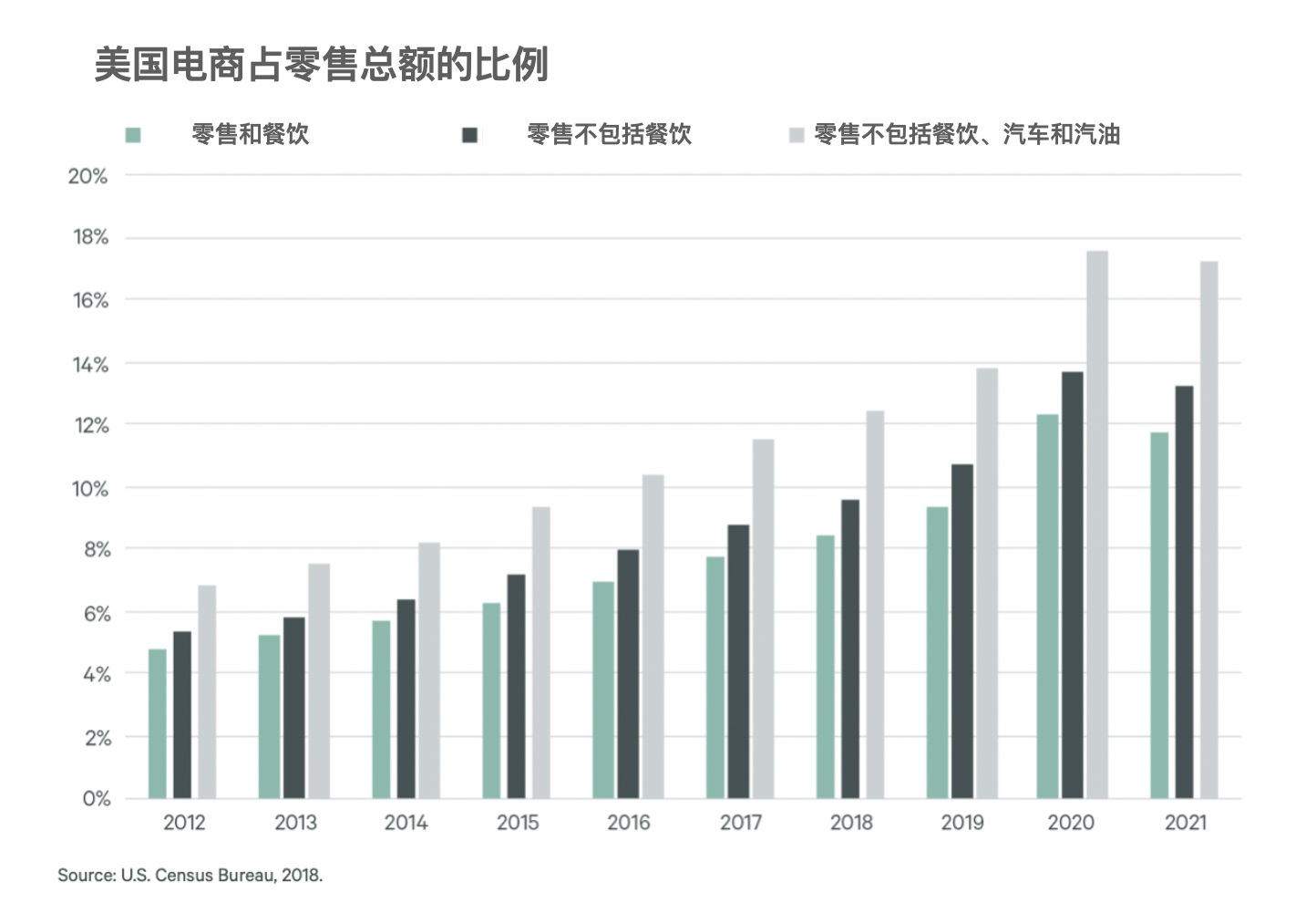John Lewis的網(wǎng)上交易在2019年之前一直維系在40%以上的水準(zhǔn),2020年爆發(fā)的新冠疫情對電商反而是一個利好和促進,John Lewis的電商銷售占比最高達(dá)到74%。2021年電商銷售為67%。業(yè)界都在關(guān)注電商新的平衡點在哪里?但對John Lewis來說應(yīng)該肯定不會回到疫情之前了。類似的情況也發(fā)生在美國的電商市場(見圖7),美國電商從2011年到2021年保持了大約每年15%的增長,2020年達(dá)到最高的32%。但是隨著疫情的趨緩,2021年又回到了15%左右。應(yīng)該說32%的增長也許只能是在有新冠疫情時才能看到的情況了。而美國的電商占零售總額的比例即使包括汽車也沒有超過18%(見圖8)