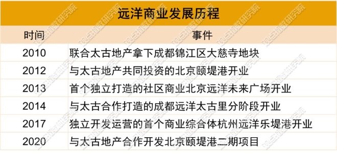 首先,從發(fā)展歷程上看,遠洋旗下商業(yè)業(yè)務受太古影響較大,在和太古合作打造兩個項目后才奠定了商業(yè)綜合體的開發(fā)模式。