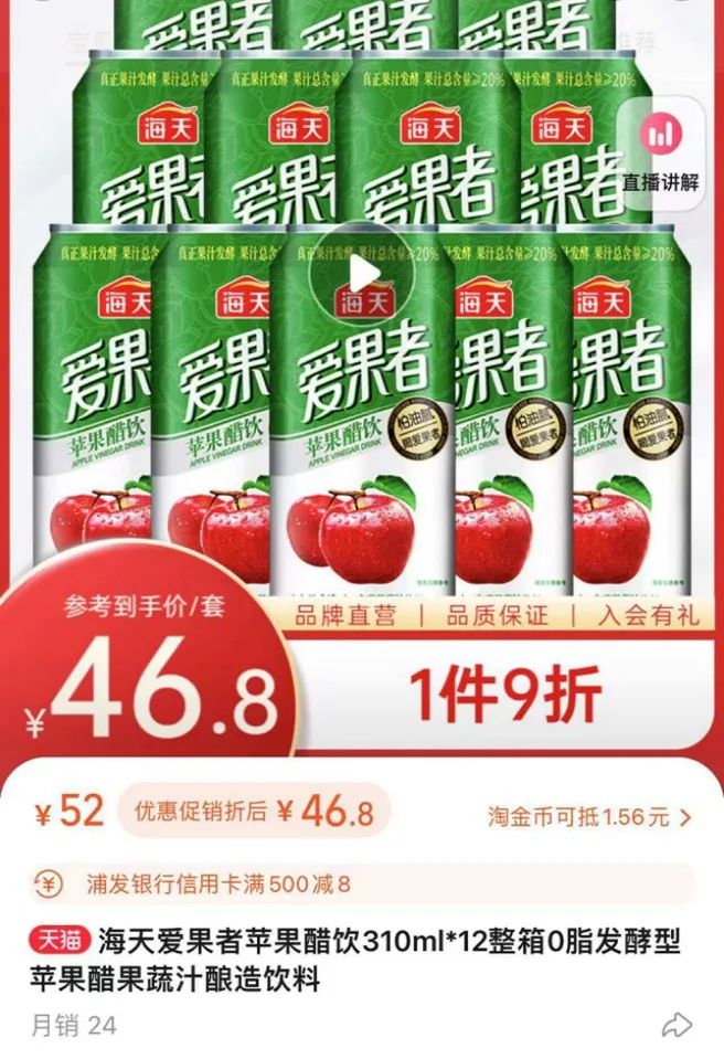 2021年3月,海天再次推出一款名為“愛果者”的蘋果醋飲料,始發(fā)零售價(jià)9元左右。如今,這款產(chǎn)品仍在海天天貓旗艦店內(nèi)售賣,但月銷僅為24。