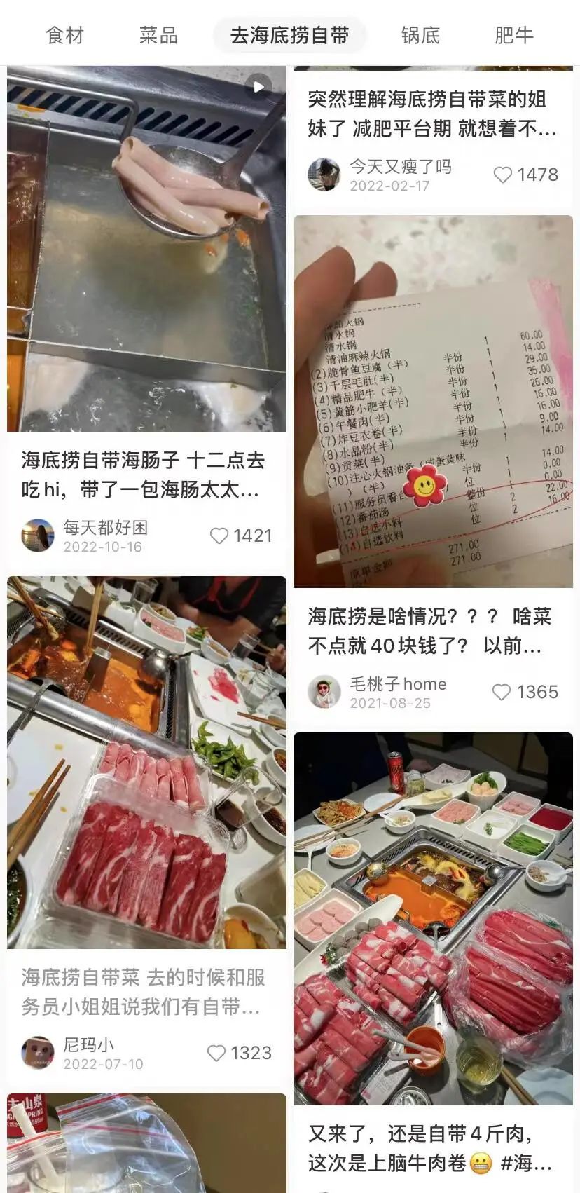 但也有不同的聲音:“不讓自帶那誰還愿意去海底撈啊”、“菜品量少還貴,就算兩個人自己帶肉去也要吃個兩三百”。