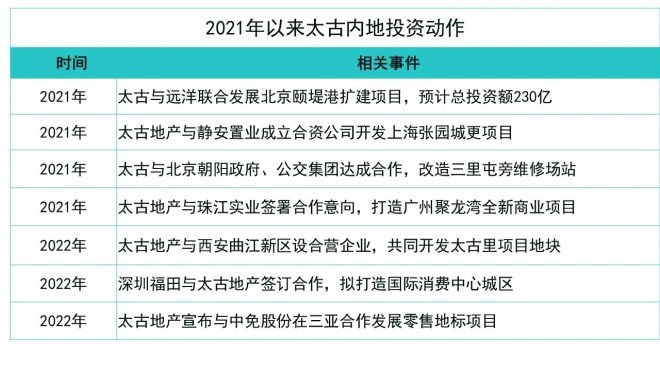 此外,目前內(nèi)地防疫政策放開,商業(yè)地產(chǎn)升溫回暖。長期來看,前景也更具想象力。落到具體項(xiàng)目上,太古是港資企業(yè)中獲得投資發(fā)展項(xiàng)目最多的企業(yè),兩年內(nèi)新增了7個(gè)項(xiàng)目。