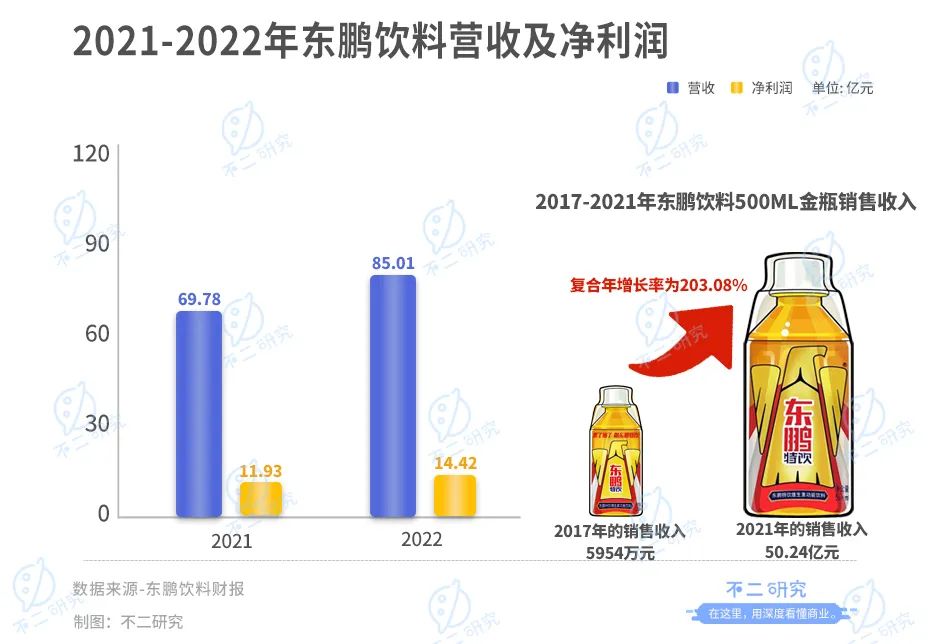 據(jù)其最新業(yè)績快報顯示,2022年東鵬飲料營業(yè)收入為85.01億元,相較去年同期的69.78億元,同比增長21.84%,主要系500ml 金瓶銷售收入的持續(xù)提升。報告期內(nèi),凈利潤達14.42 億元,同比增長20.87%。