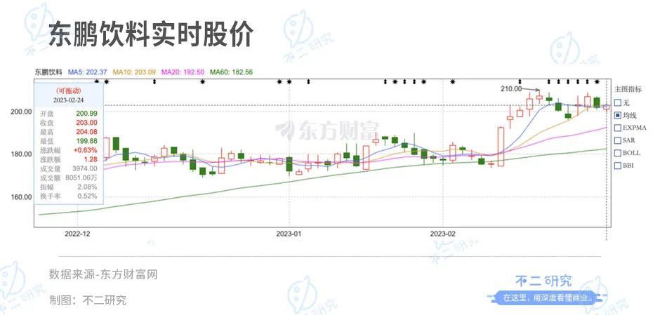 東鵬飲料三季報公布后的首個交易日,其股價下跌-2.58%。截至2023年2月24日收盤,東鵬飲料報收203.00元/股,對應(yīng)市值810.20億元。對比此前巔峰期的總市值1142.8億元,已經(jīng)蒸發(fā)超過300億元。