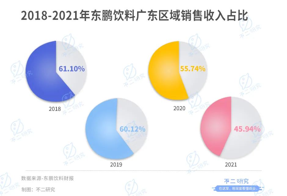 根據(jù)東鵬飲料2021年報顯示:其廣東區(qū)域(包括除南區(qū)特通渠道外的廣東省、海南。┰谥鳡I業(yè)務(wù)收入占比有所下降,但仍高達45.94%。