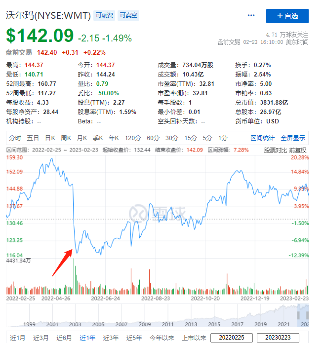 截至美東時(shí)間2月23日,沃爾瑪盤前交易最新股價(jià)為142.09美元每股,總市值為3831.88億。