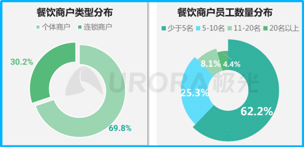 中小微商家一直是餐飲外賣行業(yè)的主流,撐起了整個市場大半邊天。根據(jù)極光大數(shù)據(jù)發(fā)布的《2021餐飲外賣商戶研究報告》,近七成餐飲外賣商戶為個體戶,62.2%的商戶僅有不到5名員工。