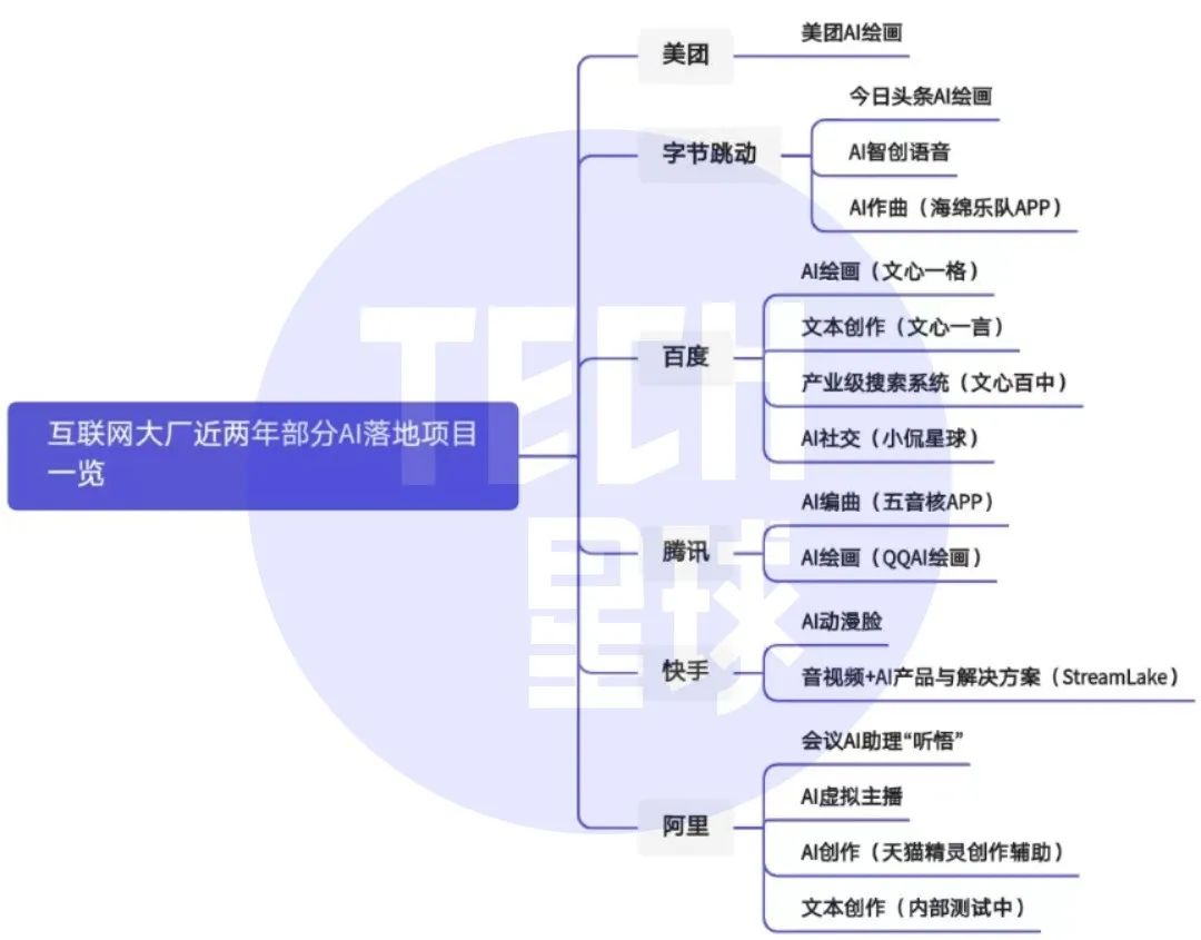 作為頭部互聯(lián)網(wǎng)大廠顯然不會(huì)放過(guò)這次新的創(chuàng)業(yè)浪潮。Tech星球通過(guò)公開數(shù)據(jù)整理了近兩年大廠在AI部分領(lǐng)域布局的產(chǎn)品和業(yè)務(wù),可以發(fā)現(xiàn),大廠從以前的B端研發(fā),移步至C端,特別是在AIGC(AI Generated Content,人工智能生成內(nèi)容)領(lǐng)域的布局更甚。