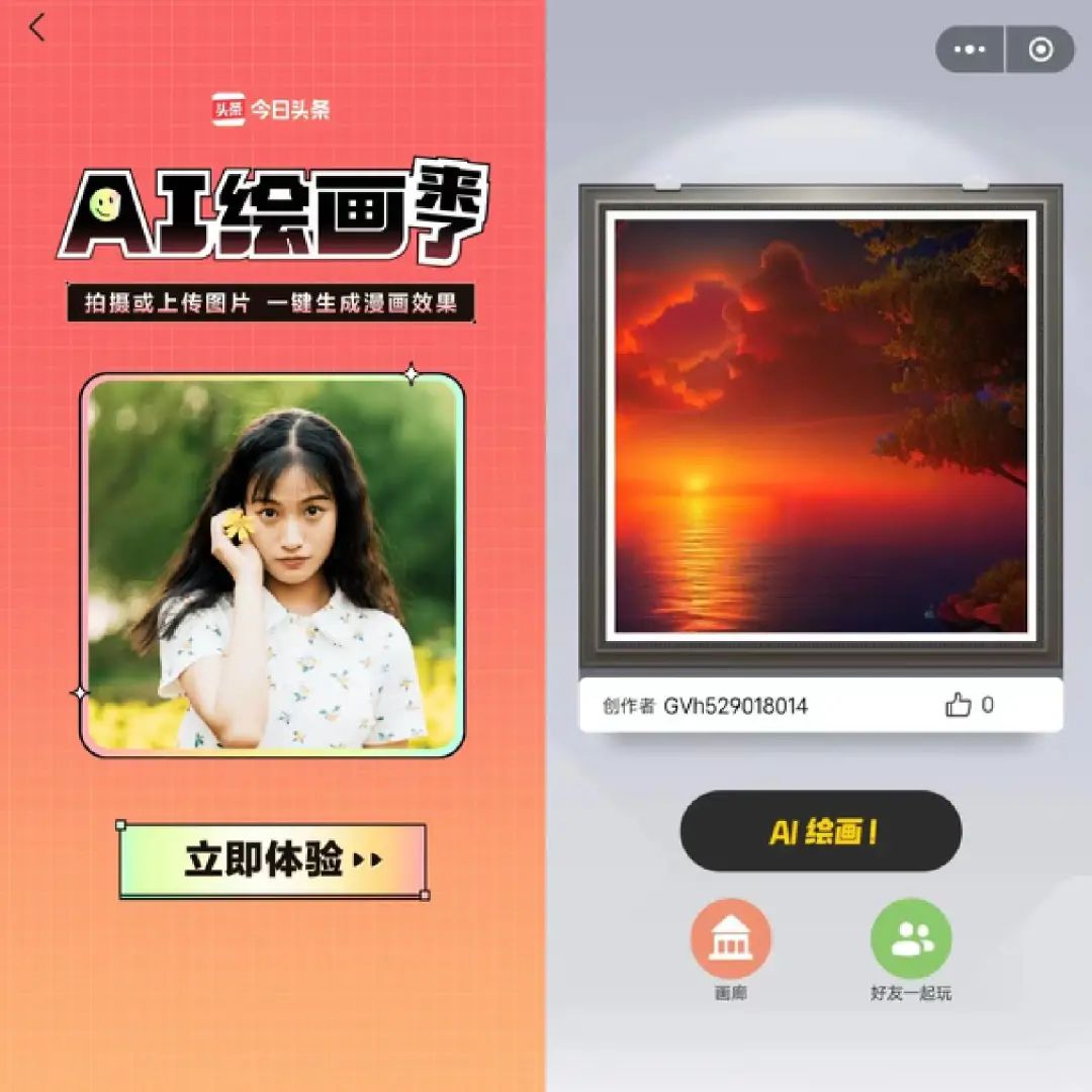 AIGC領(lǐng)域最廣的當(dāng)屬AI繪畫,字節(jié)旗下的今日頭條APP,以及美團(tuán)APP都推出了各自的繪畫功能。今日頭條的AI繪畫位于“個(gè)人中心”內(nèi),用戶只需要拍攝或上傳圖片,即可一鍵生成漫畫效果的圖片,還可以發(fā)布到今日頭條,作為今日頭條圖片創(chuàng)作的一部分。