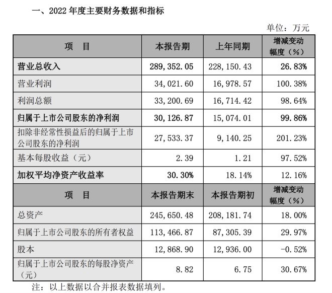 報(bào)告期內(nèi),鹽津鋪?zhàn)訉?shí)現(xiàn)營(yíng)業(yè)收入28.94億元,較上年同期增長(zhǎng)26.83%;營(yíng)業(yè)利潤(rùn)3.40億元,同比增長(zhǎng)100.38%;利潤(rùn)總額3.32億元,同比增長(zhǎng)98.64%;歸屬于上市公司股東的凈利潤(rùn)3.01億元,同比增長(zhǎng)99.86%;扣除非經(jīng)常性損益后的歸屬于上市公司股東的凈利潤(rùn)2.75億元,同比增長(zhǎng)201.23%;基本每股收益2.39元,較上年同期增長(zhǎng)97.52%。2022年加權(quán)平均凈資產(chǎn)收益率30.30%。