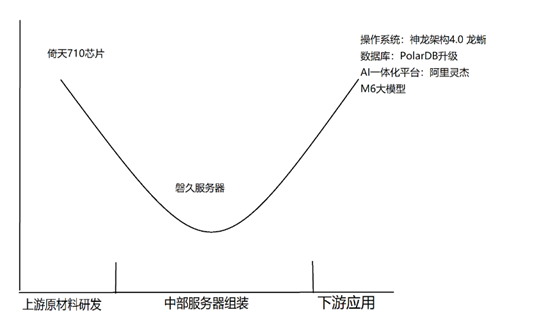 在傳統(tǒng)云計算時期,上游芯片供應商和下游應用端能拿走大部分利潤,而傳統(tǒng)服務器集成商的利潤水平很低。很多人認為國產(chǎn)云廠商只能攫取微笑曲線底部的利潤,但是對于阿里云,卻并非適用:它已經(jīng)實現(xiàn)了產(chǎn)業(yè)上下游高價值帶的布局。