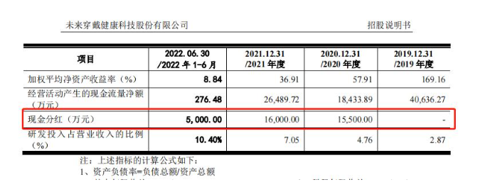 另據(jù)招股說明書顯示,2020年到2022年6月末,未來穿戴進行5次分紅,金額分別為5500萬元、10000萬元、6000萬元、10000萬以及5000萬元,占當期凈利潤的比重分別為83.13%、102.89%、86.07%。