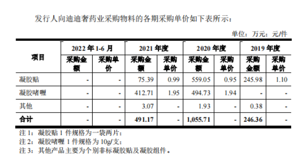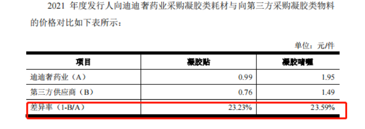 但即使在關聯(lián)交易之下,采購的價格不但沒有變高,反而還存在著溢價采購的情況。以2021年為例,迪迪奢藥業(yè)的凝膠貼價格和凝膠啫喱的價格均比第三方供應商高出23%以上。