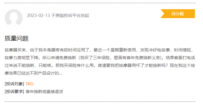 除電商平臺外,在黑貓投訴平臺上,也有不少消費者投訴稱SKG的產(chǎn)品質量存在問題。其中,消費者A稱一周后重新使用SKG的產(chǎn)品存在著按摩力度下降的問題,但SKG的客戶卻拒絕為消費者換新。