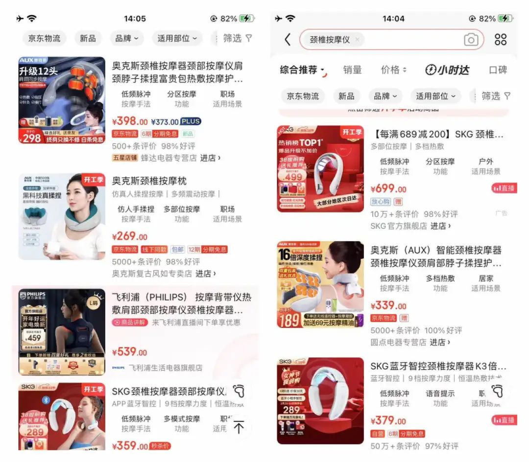 其次,SKG所處的賽道本身就是一個競爭異常慘烈,產(chǎn)品高度同質化的賽道。以頸椎按摩儀為例,除松下、飛利浦、奧克斯、康佳等老牌家電企業(yè),還有倍輕松、米家、網(wǎng)易嚴選、小熊電器等企業(yè)紛紛在進入這一賽道。產(chǎn)品同質化下,大家在電商平臺上只能比拼價格。