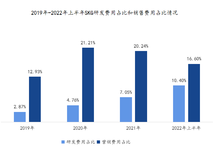 SKG曾表示,“研發(fā)創(chuàng)新能力及技術應用能力是公司贏得未來競爭的關鍵因素。基于此,其在2019年到2022年上半年所投入的研發(fā)費用分別為2275.49萬元、4714.06萬元、7472.59萬元、4518.4萬元。但若是將研發(fā)費用占比和銷售費用占比進行對比的話,也不能看出目前SKG的業(yè)務重心還是放在銷售上。
