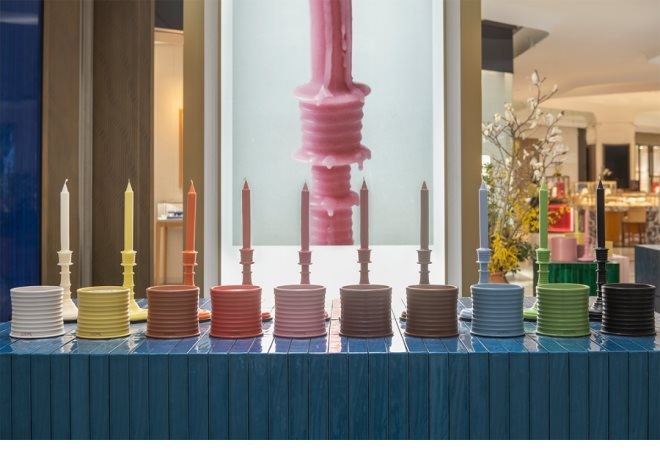 首店內的展臺有序陳列著植物彩虹系列香氛,宛如一個斑斕紛呈的萬花筒,香味和色彩在干凈而多元的背景下熠熠生輝。另外,羅意威家居香氛系列也在這里一一展示,包括香氛蠟燭與燭臺、家居香水與香薰、香氛精油香皂與液體皂。