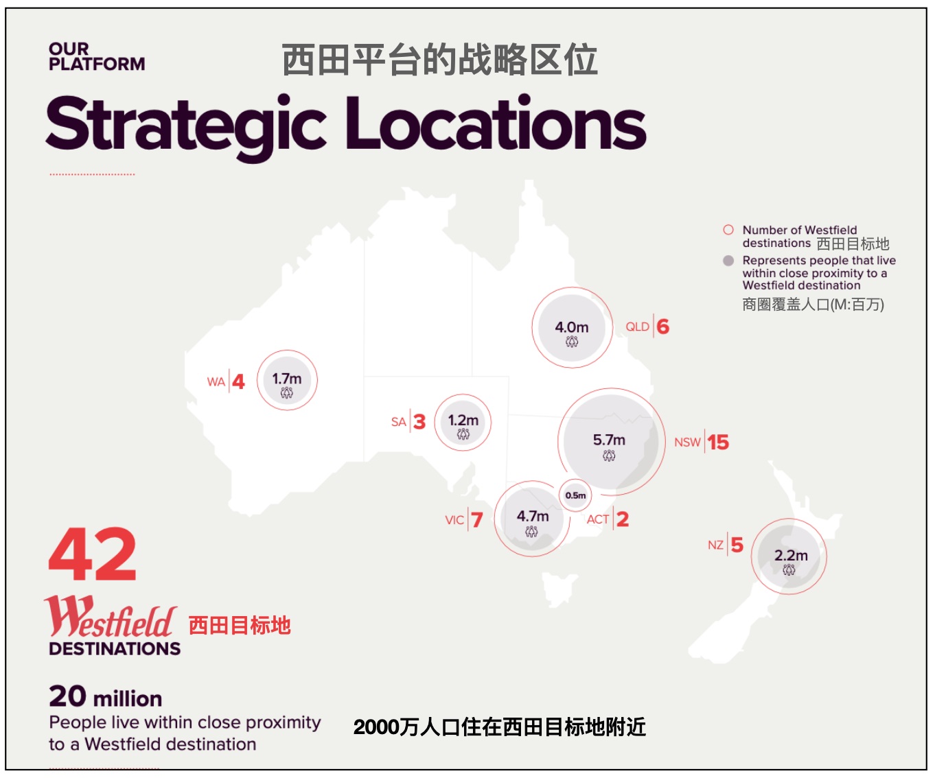 簡報在開始概述SCG集團在澳大利亞和新西蘭的購物中心時,首先提到的是商業(yè)地產(chǎn)企業(yè)最關(guān)注的資產(chǎn)價值問題。西田全部42家稱之為“西田生活廣場”的購物中心總資產(chǎn)為512億澳元,其中SCG投資350億澳元,第三方基金162億澳元。SCG集團擁有這些資產(chǎn)的永久管理權(quán)。報告標注了每一個西田生活廣場所在的位置和覆蓋的商圈人口(以開車30分鐘距離為限)。這樣你就可以清楚地從圖1看到西田在澳大利亞和新西蘭的購物中心覆蓋了這兩個國家大約2000萬的人口。