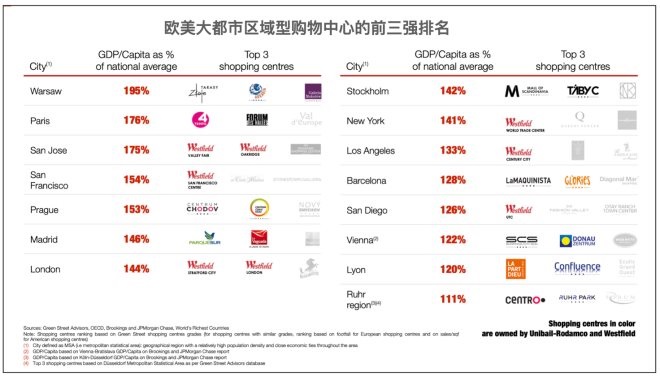 圖5是布魯金斯學院和國際經(jīng)合組織對歐美大都市的購物中心根據(jù)人流量和銷售額的排名。可見在倫敦、紐約、洛杉磯、舊金山這些只要有西田購物中心的城市,西田就一定是這個城市第一名的購物中心;如果在這個城市有兩個購物中心,比如倫敦和圣何塞(硅谷),那么第二名的購物中心也是西田的。