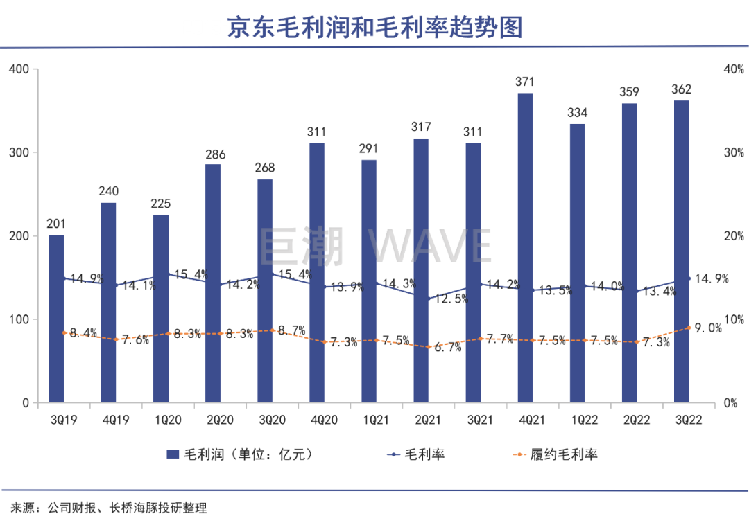 與此同時(shí),京東毛利率持續(xù)提升,2022Q3履約后毛利率達(dá)到9%,創(chuàng)三年最高水平。而公司管理層解釋稱,主要原因是減少了用戶補(bǔ)貼。
