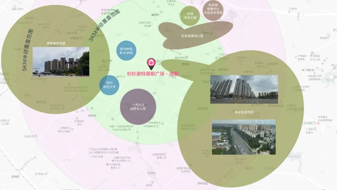 項(xiàng)目周邊3公里范圍覆蓋著戶(hù)數(shù)超5萬(wàn)戶(hù)近60個(gè)小區(qū)、人口22萬(wàn)左右;周邊5公里范圍涵蓋戶(hù)數(shù)近10萬(wàn)戶(hù)超360個(gè)小區(qū)、人口70萬(wàn)左右,同時(shí)大專(zhuān)院校有20多所(四川師范大學(xué)、四川財(cái)經(jīng)職業(yè)學(xué)院等),坐擁穩(wěn)定客流。