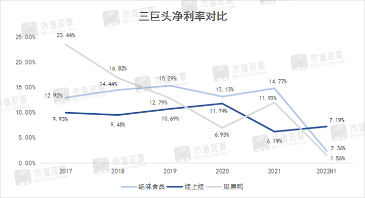 這一點從三家凈利率也能看出來。絕味從2019年的15.29%降至2022年中報的2.36%,周黑鴨從12.79%降至1.56%,煌上煌則由10.69%降至7.19%。