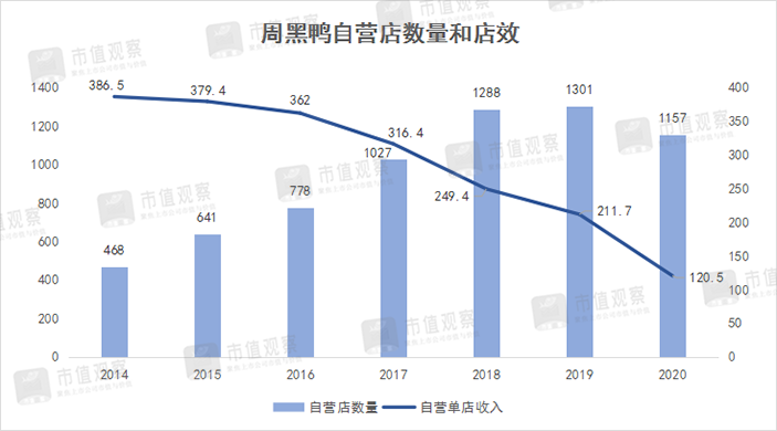 這主要由于其自營店效的不斷下降及自營店開店的放緩。早在2014年周黑鴨直營店效就不斷下降,從當年的386.5萬降至2020年的120.5萬,而直營店數(shù)量在2018年達到1288家后就停止增長,到2022年上半年只有1342家。
