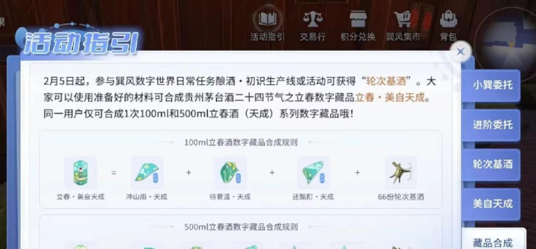 高溢價來源于巽風的游戲型玩法。站內(nèi),用戶需要通過做任務(wù)賺取積分,根據(jù)積分榜排名的高低獲得相應(yīng)數(shù)字藏品,而這些數(shù)字藏品對應(yīng)的核心權(quán)益正是原價購買實體茅臺酒的資格。