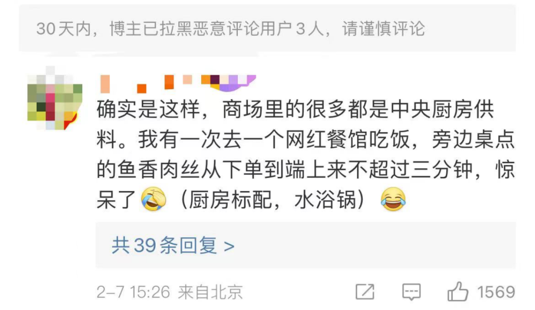 “確實(shí)是這樣,商場(chǎng)里的很多都是中央廚房供料。我有一次去一個(gè)網(wǎng)紅餐廳吃飯,旁邊桌點(diǎn)的魚香肉絲從下單到端上來不超過三分鐘,驚呆了!
