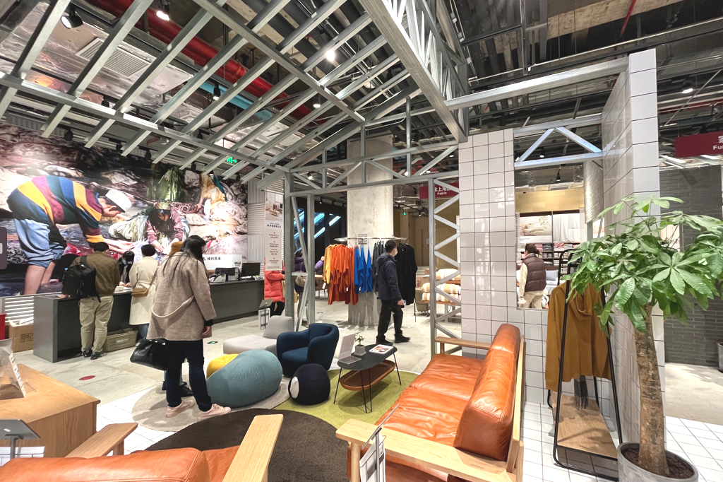 住的部分:以輕盈明快為大面定調(diào),以木質(zhì)陳列塑造暖性環(huán)境,并配合部分空間場(chǎng)景還原,給予顧客帶入感,如以沙發(fā)、茶幾、掛衣架等物件擺放塑造客廳生活場(chǎng)景;