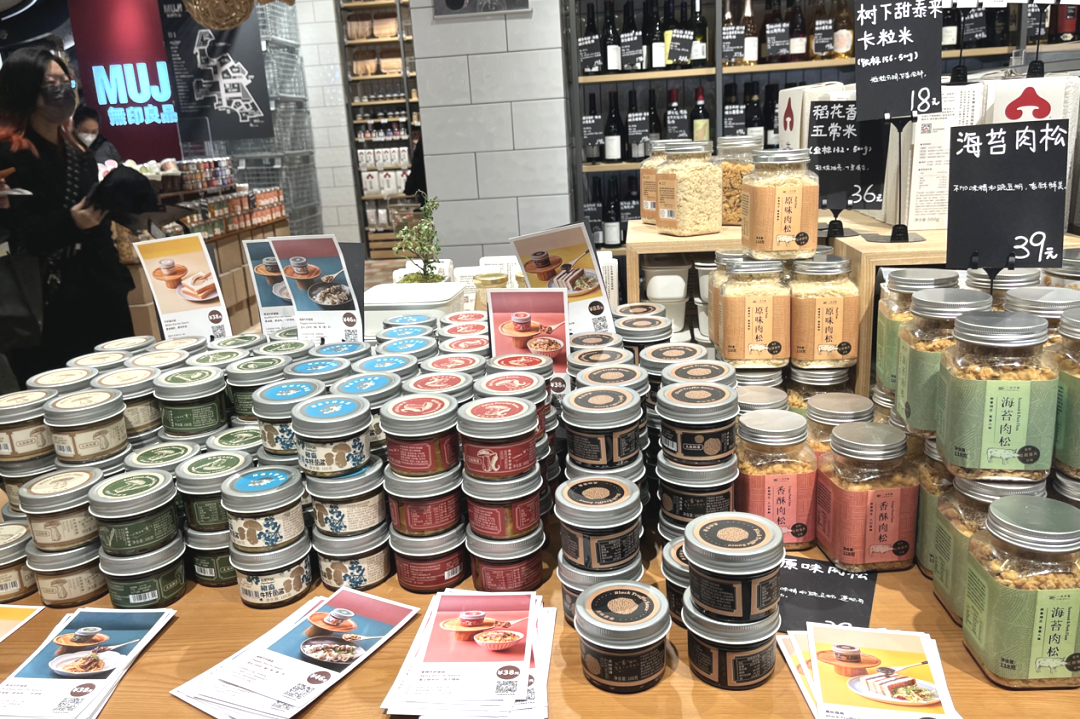此外,與B1室內(nèi)中庭鄰近的高人流區(qū)域,MUJI集中放置了具有相似品牌理念、本土特色的其他品牌產(chǎn)品代銷(xiāo)售賣(mài),如一米市集的肉松系列、大地物源的菌菇醬系列。