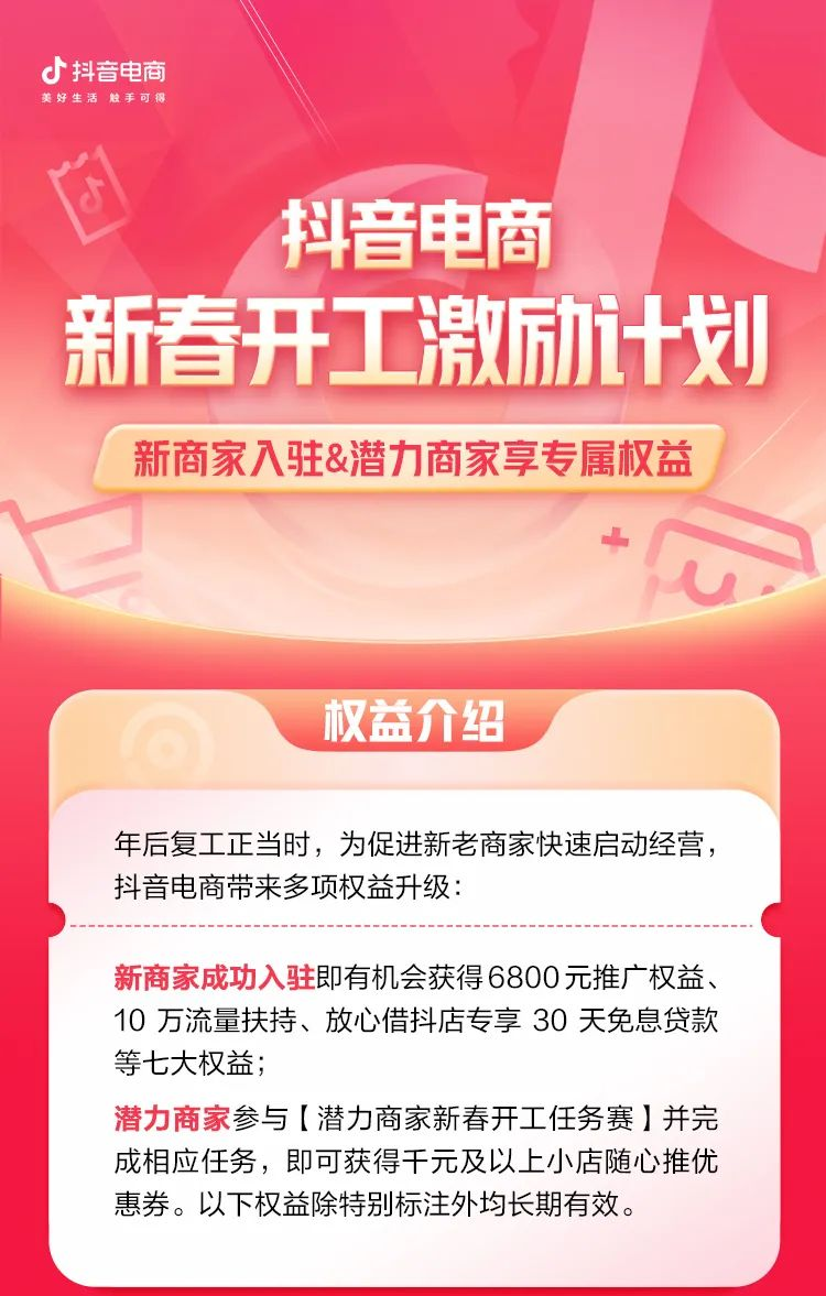 另外,2月6日到3月31日,抖音電商還為指定的潛力商家?guī)韺贆嘁,參與“潛力商家新春開工任務賽”,只要完成制定任務,商家即可獲得千元及以上小店隨心推優(yōu)惠券的權益獎勵。