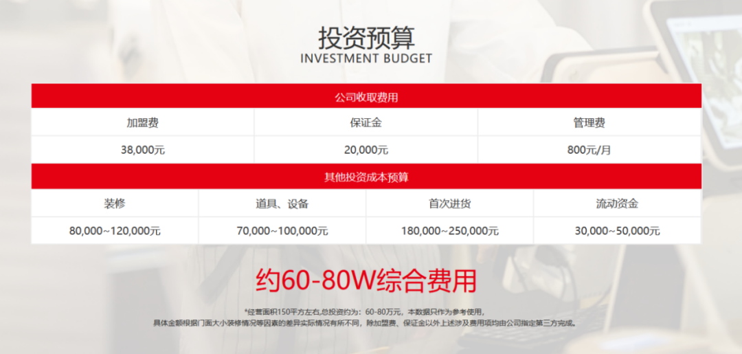 官網(wǎng)給出的資金預(yù)算顯示,公司收取加盟費(fèi)3.8萬(wàn)元、保證金2萬(wàn)元及管理費(fèi)用800元/月,其余費(fèi)用包括裝修、道具設(shè)備、首次進(jìn)貨及流動(dòng)資金,綜合費(fèi)用約60-80萬(wàn)元。