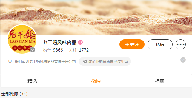 比起抖音賬號的活躍度,老干媽的微博賬號不僅連企業(yè)資質(zhì)都沒有,甚至微博內(nèi)容數(shù)量都為零。