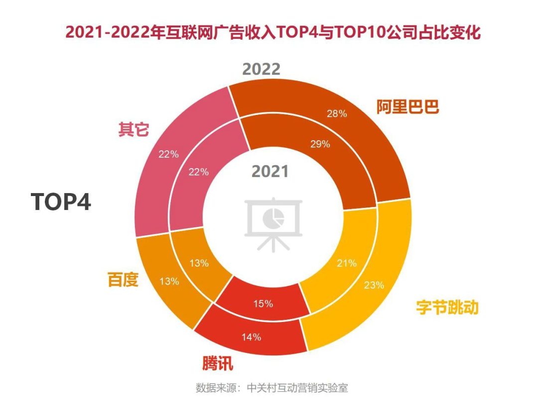 中關村互動營銷實驗室發(fā)布的《2022中國互聯(lián)網廣告數(shù)據(jù)報告》(下文簡稱“《報告》”)顯示,阿里巴巴、字節(jié)跳動、騰訊、百度這四家企業(yè),廣告業(yè)務占比高達78%,而行業(yè)Top5-10企業(yè)則分別是京東、美團、快手、小米、拼多多和微博。