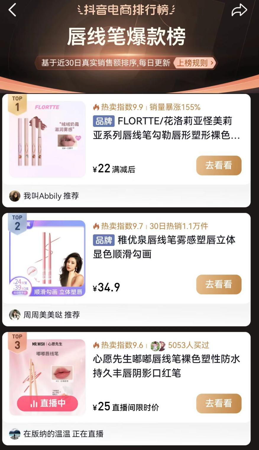 在抖音平臺,售價29.9元的花洛莉亞「怪美莉亞系列」唇線筆居“唇線筆爆款榜”第一名,熱賣指數(shù)達(dá)9.9,銷量暴漲155%。稚優(yōu)泉唇線筆排名第二,近30天銷售數(shù)量達(dá)1.1萬件。