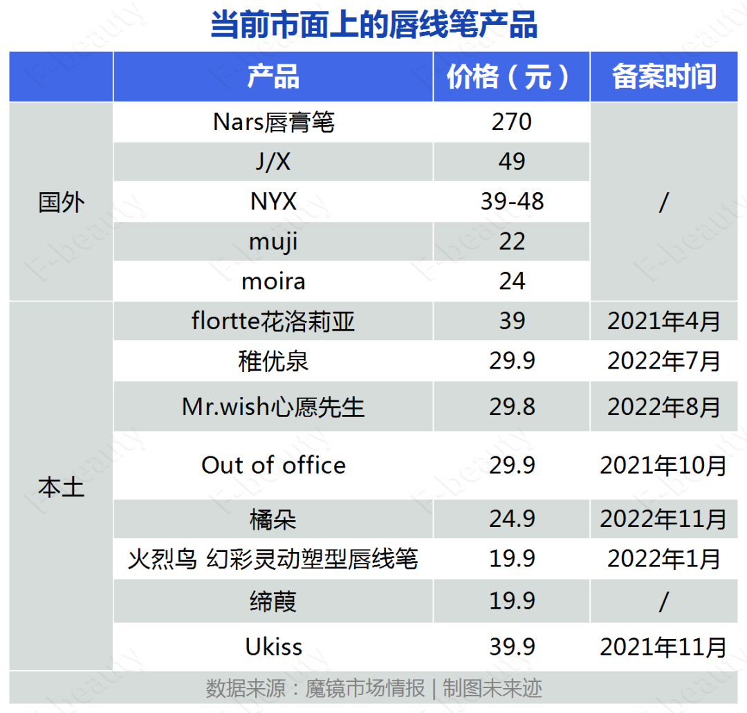 可以發(fā)現(xiàn),基于國外更加大膽、多元的妝容審美之下,國外美妝品牌如NARS、NYX等早早推出了唇線筆以滿足細(xì)化群體的妝容需求。而在國內(nèi),唇線筆在“過時”之后基本退出了市場,當(dāng)前的唇線筆市場多被年輕的新銳美妝品牌占據(jù),并且其上新唇線筆單品的時間集中在2021—2022年。