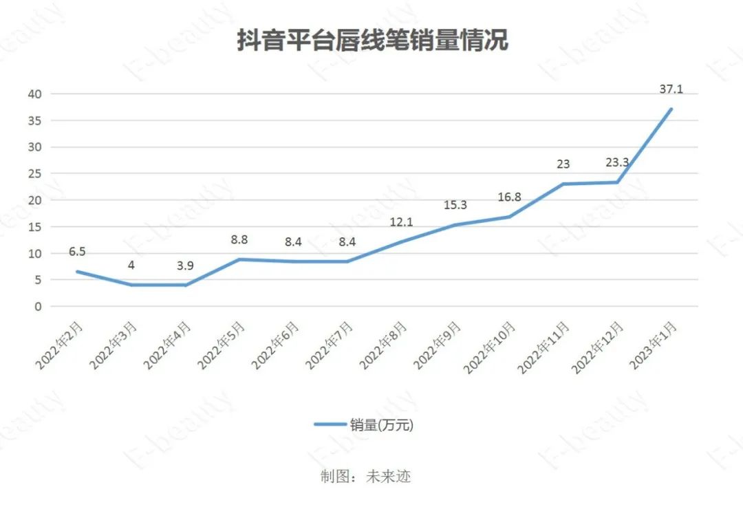據(jù)魔鏡市場情報數(shù)據(jù)顯示,2022年抖音平臺的唇線筆銷量有明顯上升趨勢。受疫情影響,2022年4月份的唇線筆銷售額創(chuàng)下全年最低,此后,唇線筆銷量逐漸上升,2022年8月銷售額突破12萬只并持續(xù)上漲。今年1月,唇線筆在抖音平臺的月銷量已超過37萬支。