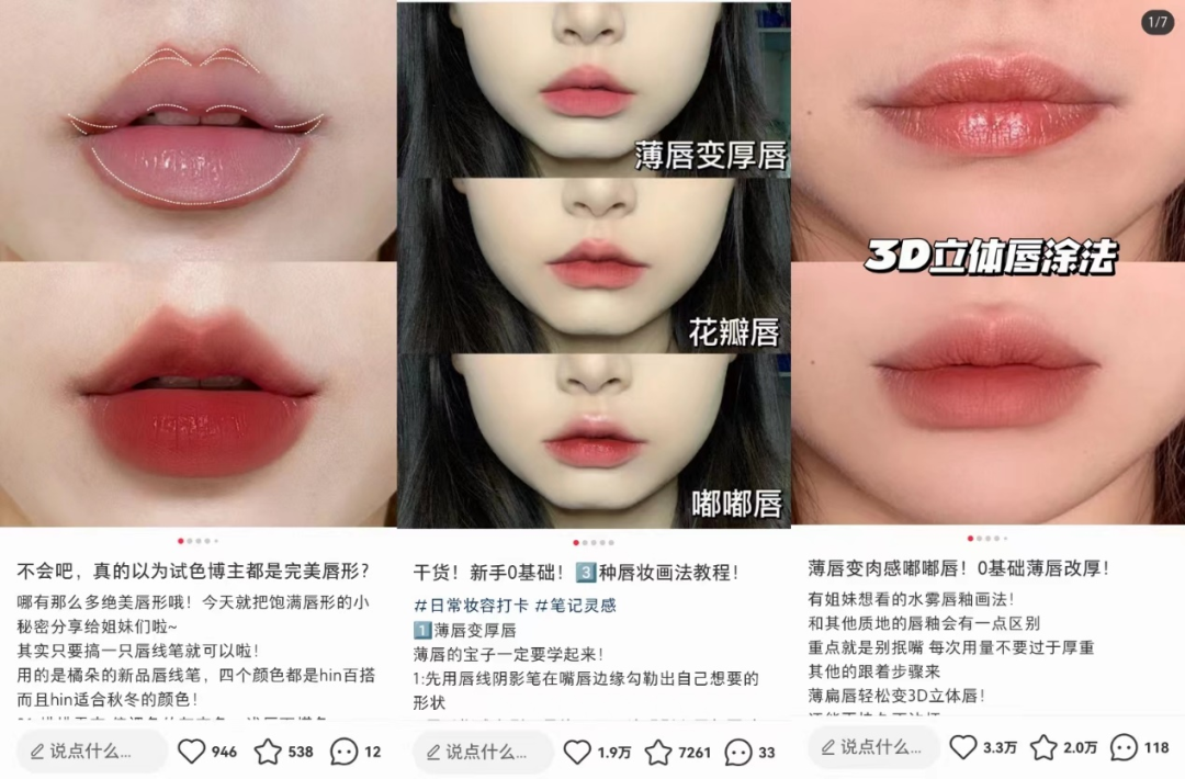 在社媒平臺,用戶們發(fā)布的內(nèi)容顯示,唇線筆主要在用于打造厚嘴唇妝容、勾勒唇形,以及改善扁平嘴等方面發(fā)揮作用;诖骄筆的“捏嘴”作用,美妝博主們的唇部教程中,唇線筆更是頻繁出現(xiàn)。