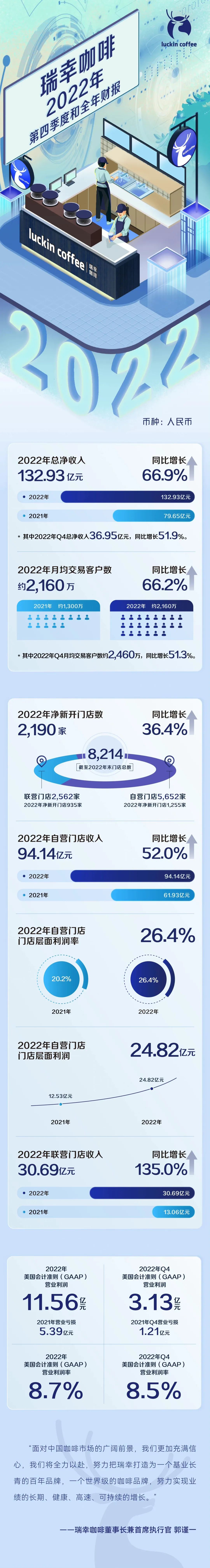 更加直白的表述是:瑞幸咖啡2022財(cái)年收入規(guī)模首次突破百億,全年整體營業(yè)利潤首次扭虧為盈。