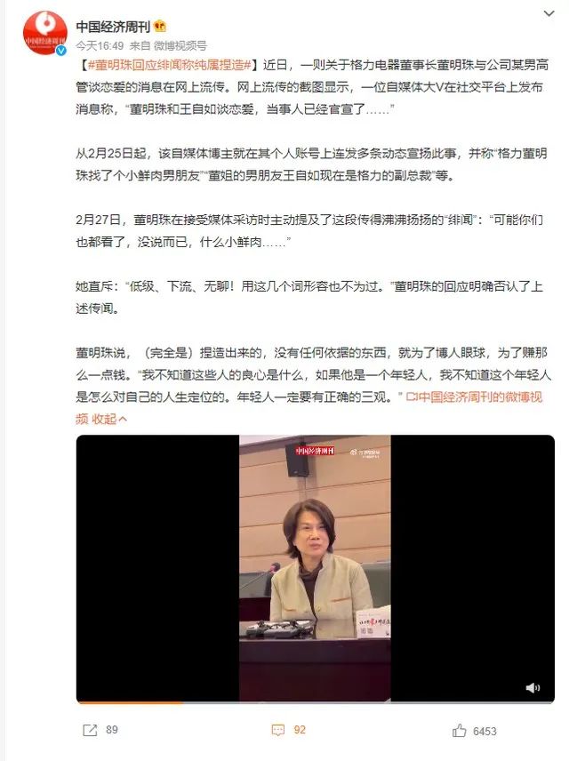 董明珠回應說,(完全是)捏造出來的,沒有任何依據(jù)的東西,就為了博人眼球,為了賺那么一點錢。“我不知道這些人的良心是什么,如果他是一個年輕人,我不知道這個年輕人是怎么對自己的人生定位的。年輕人一定要有正確的三觀!