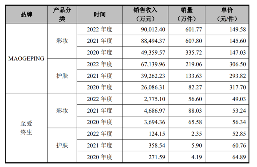 具體到品牌端,2020年至2022年,毛戈平品牌銷售收入分別為7.54億元、12.8億元、15.71億元,2021年至2022年同比分別增長69.34%、23.01%。同期,至愛終生品牌銷售收入分別為3965.94萬元、5045.52萬元和2899.25萬元,占主營業(yè)務(wù)收入比例分別為4.60%、3.59%和1.76%。