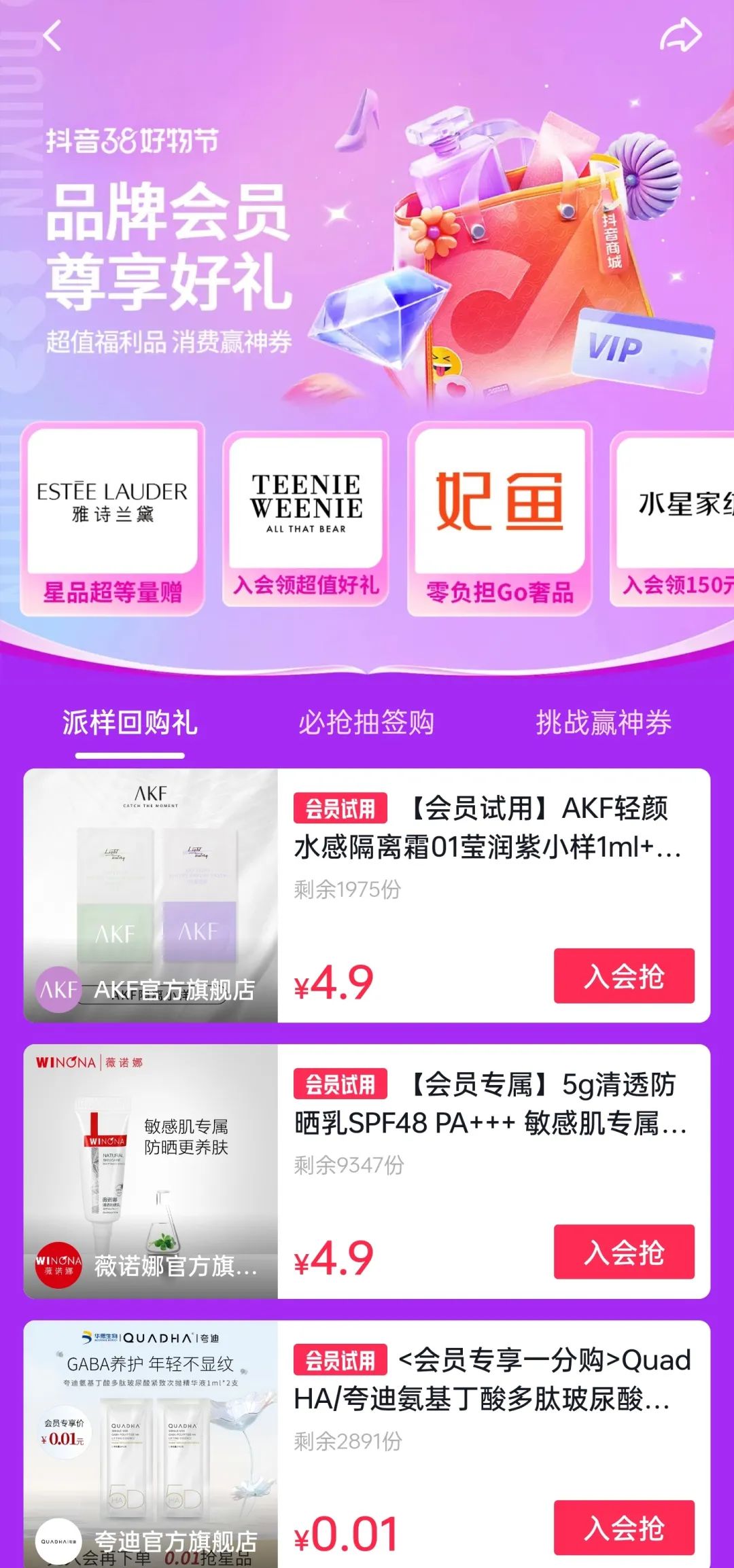 在這樣的情況下,即使只是為了長(zhǎng)遠(yuǎn)的復(fù)購率做打算,貨架商城也有其必要性。像是抖音在這次“3·8”活動(dòng)中,還專門給品牌會(huì)員設(shè)置了一個(gè)板塊。用戶在這里可以免費(fèi)試用、1元購、領(lǐng)大額券,唯一的要求就是必須加入到特定的品牌會(huì)員當(dāng)中。