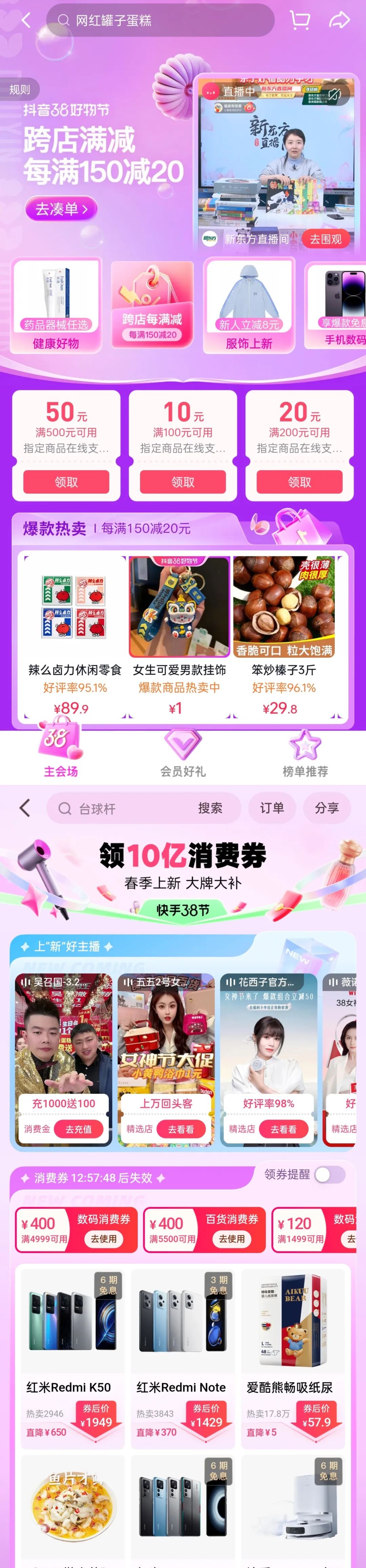 而內(nèi)容電商出身的抖音、快手也沒閑著,目前兩個(gè)平臺(tái)內(nèi)都已上線了大促板塊。二者都是典型的貨架電商風(fēng)格,囊括了“搜索”“領(lǐng)券”“商品展示”等經(jīng)典元素。甚至連主打內(nèi)容的直播間,都成為了貨架展示的一部分。