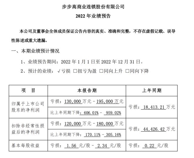 1月15日,步步高發(fā)布2022年業(yè)績預(yù)告,預(yù)計2022年虧損13億-19.5億,同比下降606%-959%。