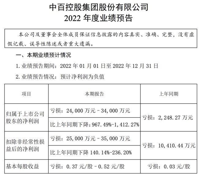 1月30日,中百集團發(fā)布2022年度業(yè)績預(yù)告。預(yù)計2022年歸屬上市公司股東的凈利潤為-2.4億元至-3.4億元,同比下降967.49%-1412.27%;扣除非經(jīng)常性損益后的凈利潤為-2.5億元至-3.5億元,同比下降140.14%-236.20%。