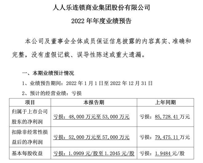 1月30日,人人樂發(fā)布2022年年度業(yè)績預(yù)告,預(yù)計2022年度歸屬上市公司股東的凈利潤為-4.8億元至-5.3億元,上一年度同期為-8.57億元,虧損同比收窄;扣除非經(jīng)常性損益后的凈利潤為-5.2億元至5.7億元,上一年度為-7.95億元。