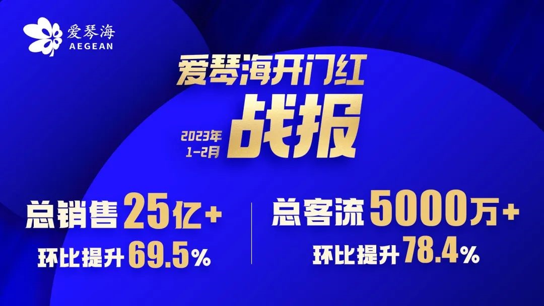聯(lián)商快訊:2023年1-2月,愛琴海集團(tuán)34城39店聚力造勢,迎來開門紅,總銷售額破25億元,環(huán)比提升69.5%;總客流超5000萬人次,環(huán)比提升78.4%;銷冠品牌超200個。